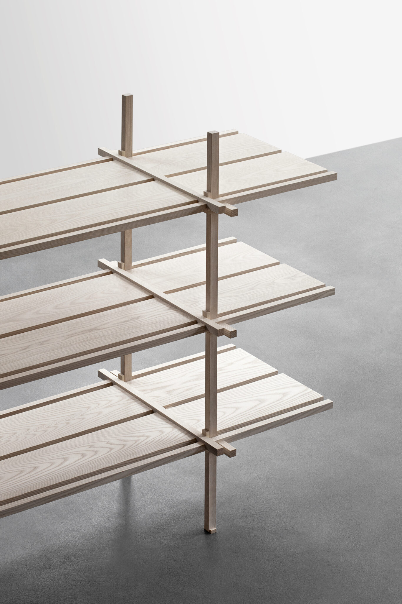 Close-up of light wood structure with intersecting beams and a smooth, textured surface.