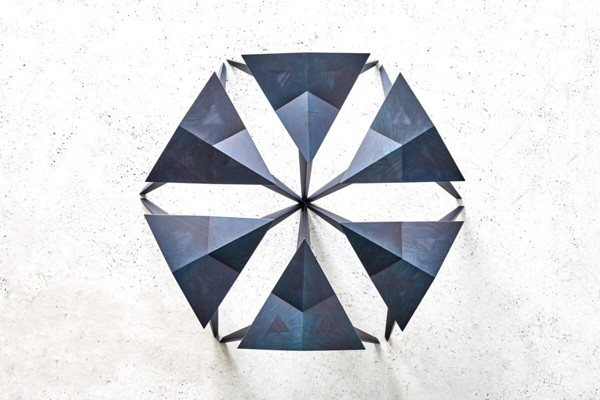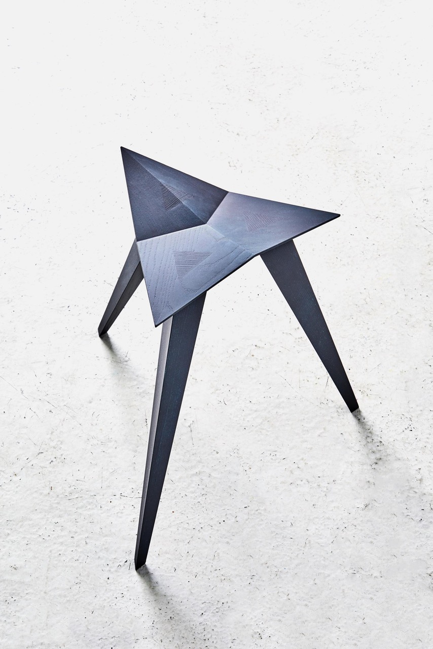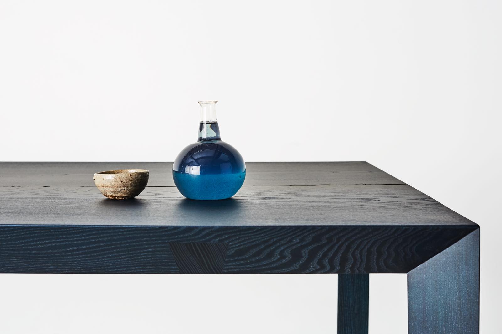 Through independent wood connections, the parts join permanently into one form. For the wood craftsman and designer, the surface finish is crucial to the character of his works. Martin Schatz stains with Japanese indigo or tins crevices in the wood. His furniture is unique and defies mechanical reproduction. No milling cutter reaches into the sharp angles and undercuts of his form-fitting wood joints. He creates a tension between the naturalness of the wood and the colored artificiality of a strictly geometric form.
