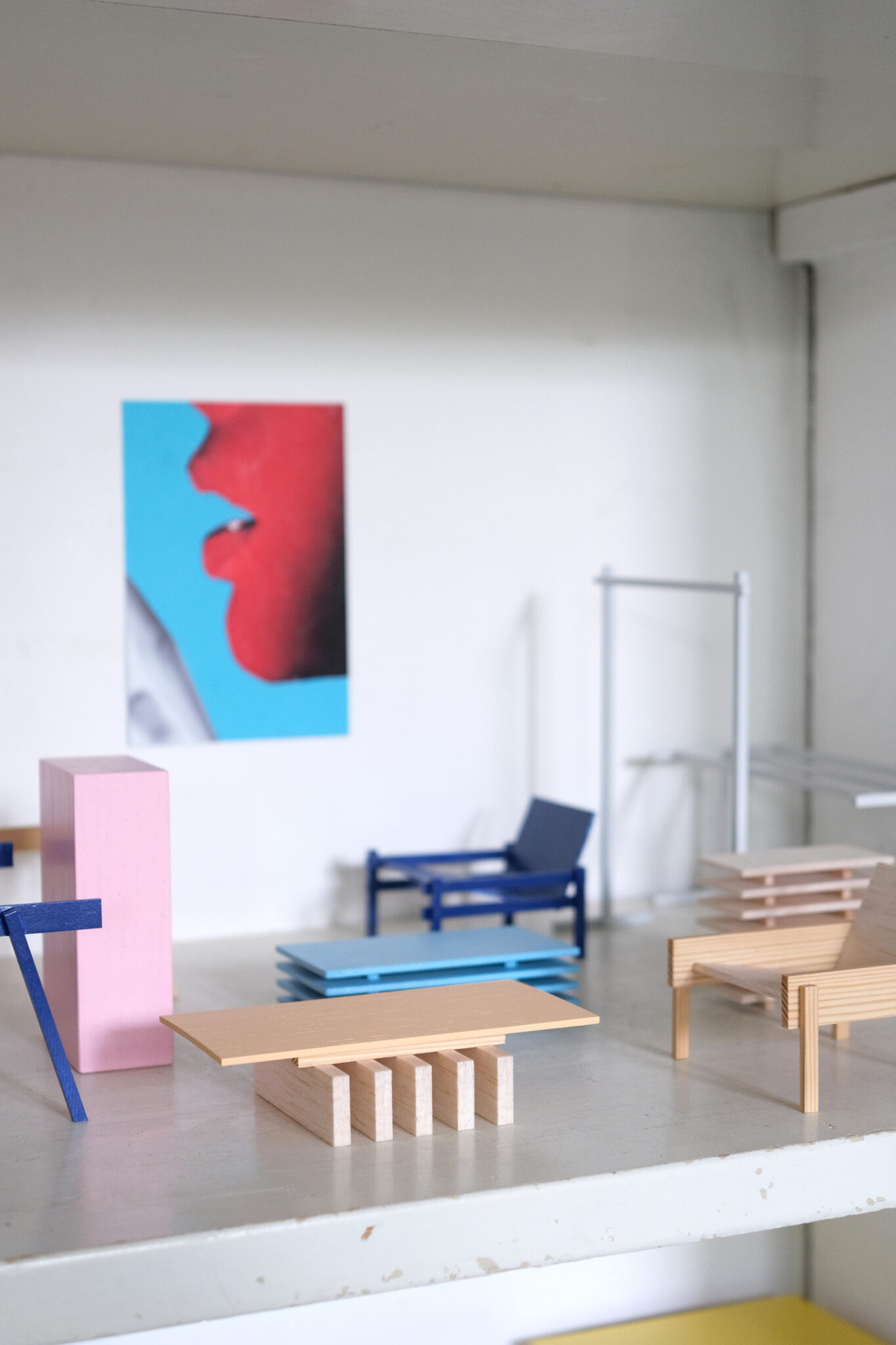 His material resembles building blocks where the components are stacked to create a striking form. Together, simple cuts of wood form furniture pieces with a strong shape and a grounded sensibility. At the same time, the designer’s use of playful colours such as baby pink and light blue accentuate the use of void space. Transparency and weight are important elements in his work as well. His Floating Light for example is a lightweighted and understandable object. All parts are visible and ‘floating’ like an exploded view of a drawing.