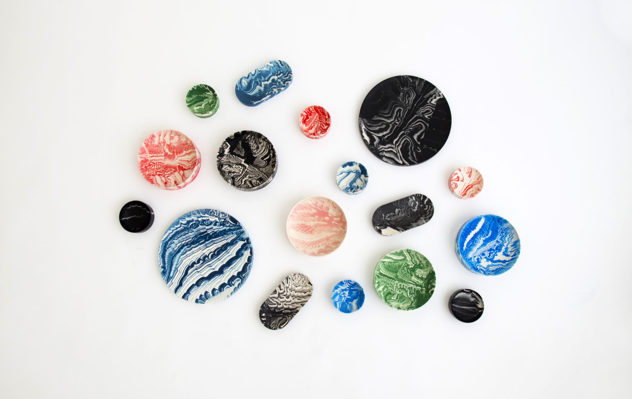 Colorful, marbled ceramic pieces in various circular and oval shapes, arranged on a white background.